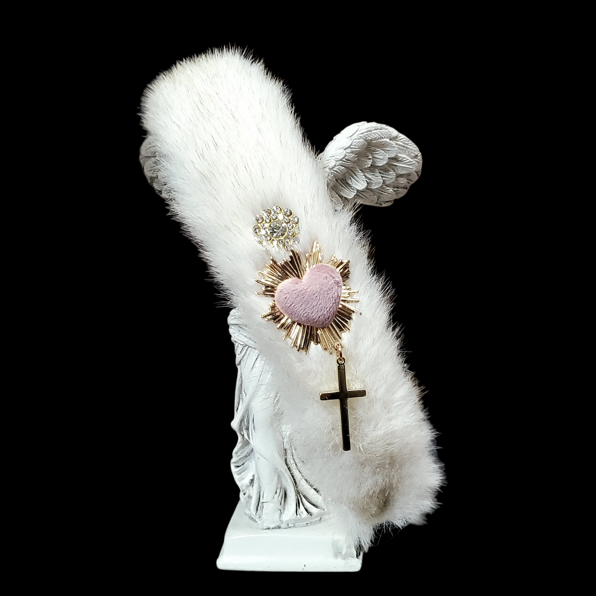 左右に同じ装飾が施してあります。 後光の中央はベロアピンクハート。 動くたびに十字架がゆらゆら動きます。 ベース:ふわふわホワイトファー
