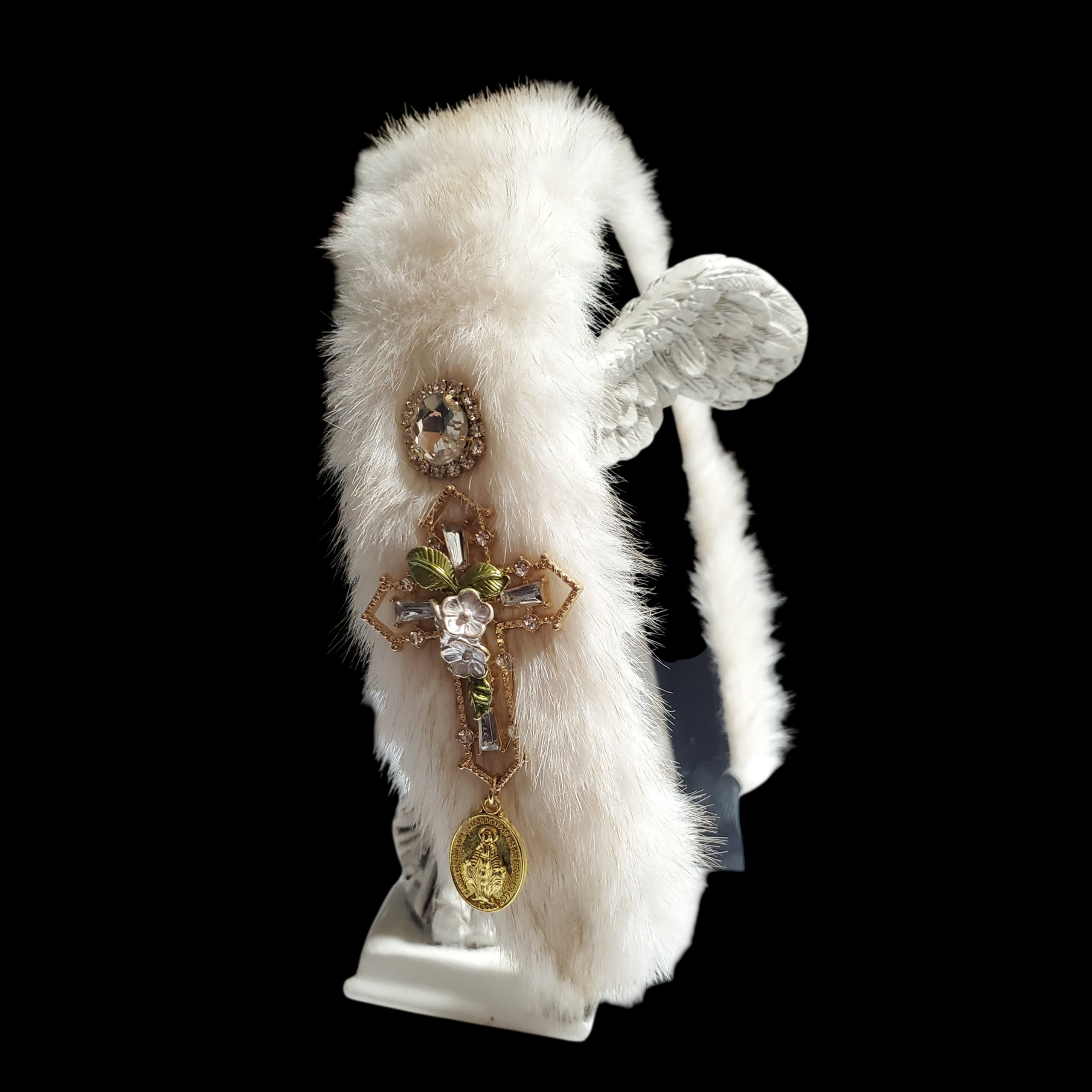 左右に同じ装飾が施してあります。 十字架の中央は白いお花と葉っぱです。 動くたびに左右のチャームがゆらゆら動きます。 ベース:ふわふわホワイトファー