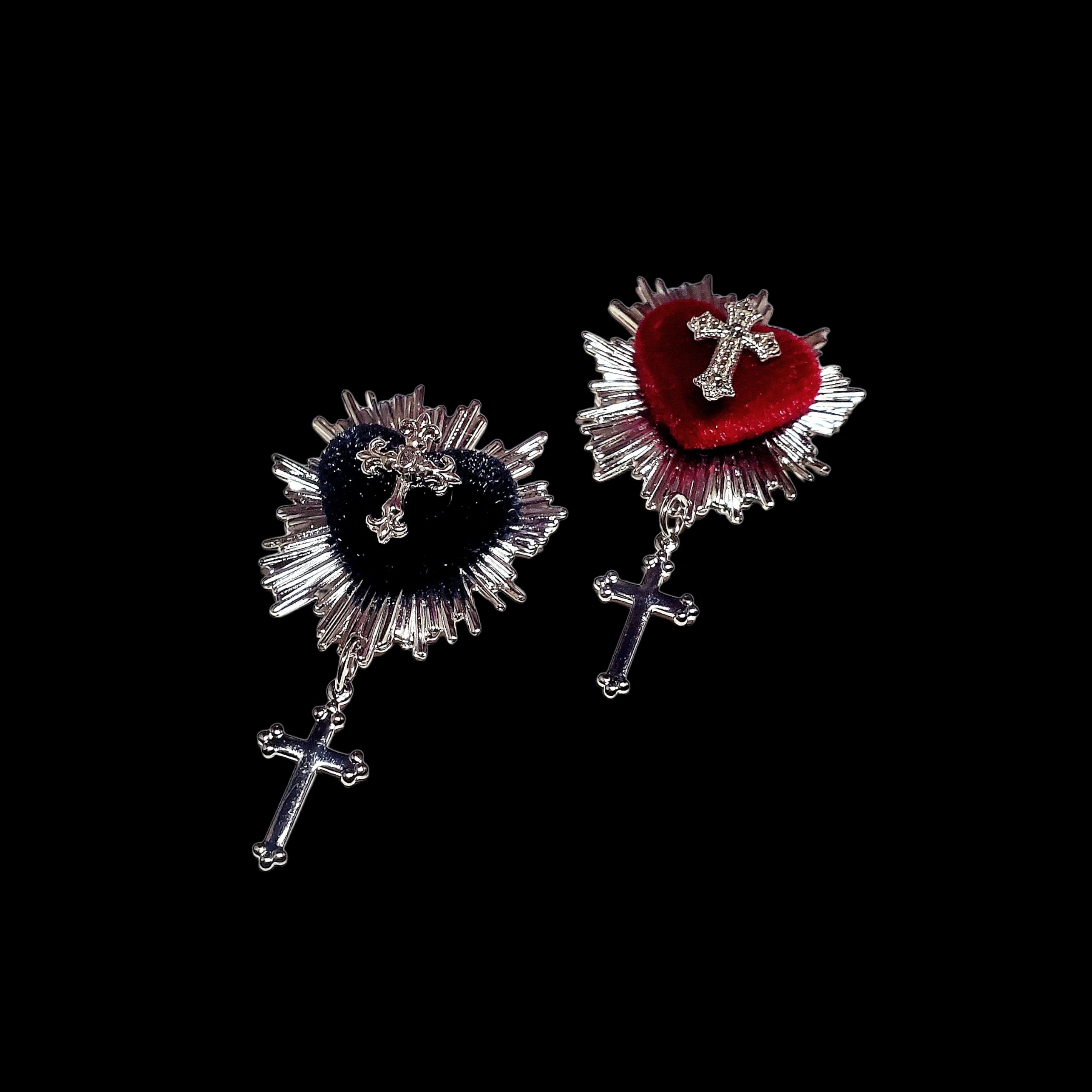 ベース:シルバー ベロアハート レッドorブラック 調整可能フリーサイズ 動くたびに十字架チャームがゆらゆら動きます。